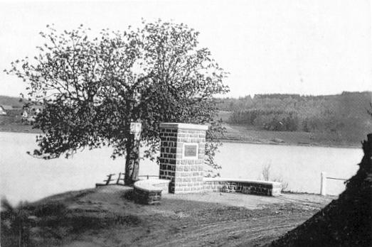 Ein Denkmal, hier aus früherer Zeit, erinnert heute an das versunkene Dorf...